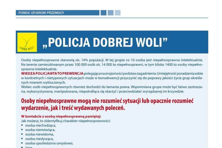 W przypadku osób niepełnosprawnych dochodzi do wielu nieprawidłowości i uchybień – z jednej strony niezauważonej krzywdy i ukrytego cierpienia, z drugiej – surowości prawa niebiorącej pod uwagę rzeczywistego podłoża problemu. Przeprowadzone pod koniec 2014 r. w Komendzie Powiatowej w Piasecznie pilotażowe zajęcia „Policja Dobrej Woli”, podczas których poruszano zagadnienia dotyczące identyfikacji i komunikacji z osobami niepełnosprawnymi intelektualnie, okazały się bardzo potrzebne (wyniki ankiety ewaluacyjnej).