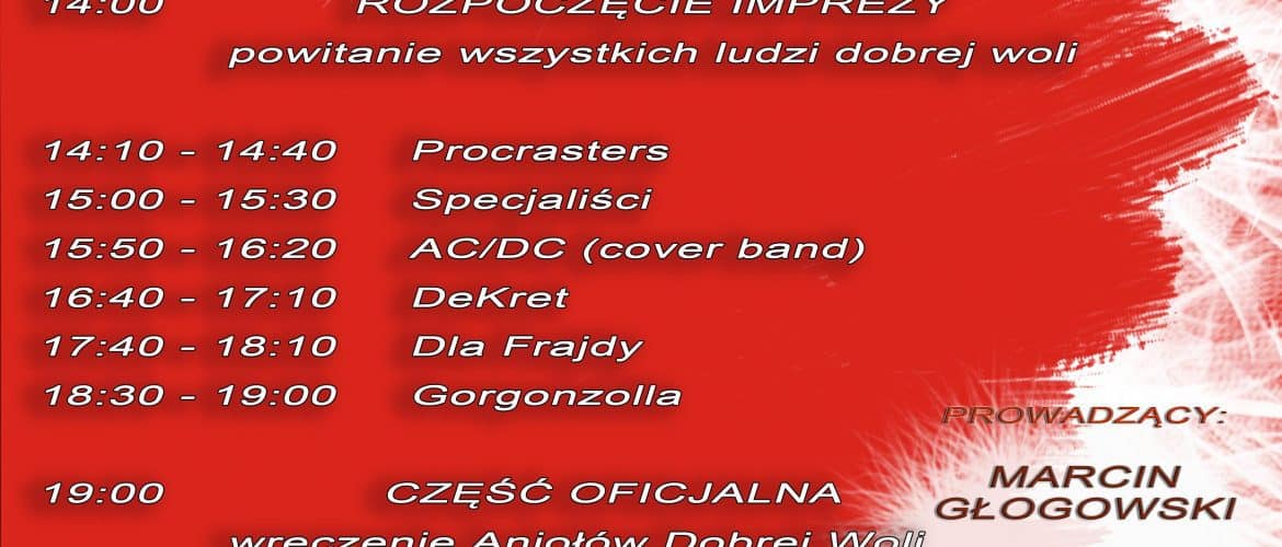 Oto harmonogram V Wolprezy Dobrej Woli. Zapraszamy wszystkich ludzi dobrej woli w najbliższy piątek 10.06.2016r. i zachęcamy do aktywnego włączenia się w trakcie festiwalu muzycznego oddając swoje głosy na wybrany zespół lub zespoły. Nie zapomnijcie o poinformowaniu przyjaciół o tej imprezie 😉